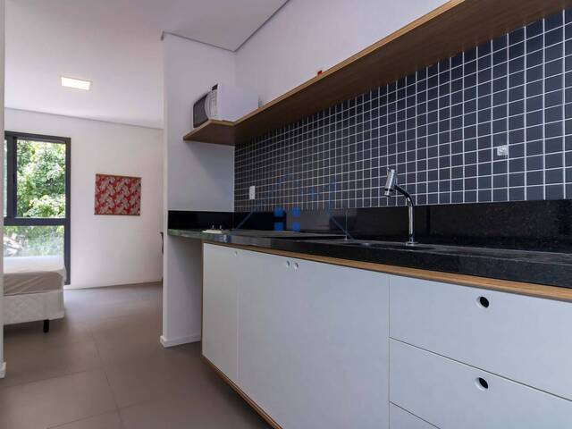 Studio com ótima marcenaria na cozinha e equipada com microondas, cooktop, geladeira, dormitório com armário, ar condicionado, cama e janelão que proporciona grande luminosidade ao ambiente. Banheiro com box de vidro e cuba de semiencaixe.